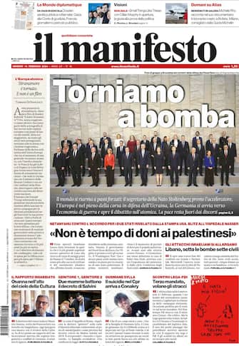 - "Torniamo a bomba" è il titolo d'apertura. Il mondo si riarma a passi forzati: il segretario della Nato Stoltenberg preme l'acceleratore, l'Europa è nel pieno della corsa in difesa dell'Ucraina. La Germania si avvia verso l'economia di guerra e apre il dibattito sull'atomica. La pace resta fuori dai discorsi. Taglio medio dedicato alla guerra Israele-Hamas e alle parole di Netanyahu: "Non è tempo di doni ai palestinesi"