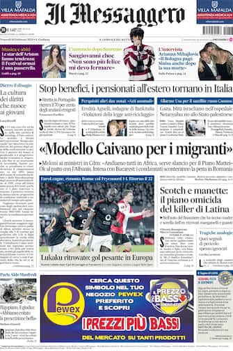 - "Modello Caivano per i migranti" è il titolo in prima pagina. Meloni ai ministri in Cdm: "Andiamo tutti in Africa, serve slancio per il Piano Mattei". Ok al patto con l'Albania, intesa con Bucarest: i condannati sconteranno la pena in Romania. In alto: "Stop benefici, i pensionati all'esterno tornano in Italia. Stretta in Portogallo, rientra il 70% degli anziani emigrati". Spazio anche al calcio, con il pareggio della Roma contro il Feyenoord nell'andata dei playoff di Europa League