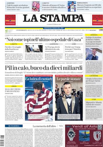 - "Pil in calo, buco da dieci miliardi" è il titolo che occupa la prima pagina. La Ue taglia le stime sulla crescita in Italia e in tutta Europa. Gentiloni alla Bce: "Ridurre subito i tassi". Il manifesto di Draghi: "L'Unione deve cambiare: servono debito, politica fiscale e difesa comuni". In alto, il conflitto in Medioriente: "Noi come topi nell'ultimo ospedale di Gaza". L'esercito fa irruzione a Khan Yunis in cerca di ostaggi di Hamas. Netanyahu: "Due Stati? Un regalo ai palestinesi"