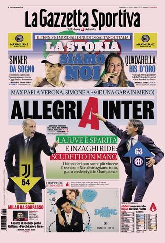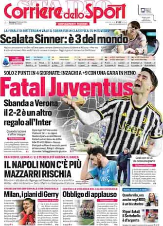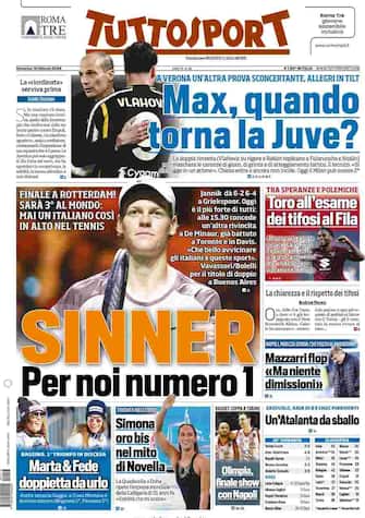 - "Scalata Sinner: è 3 del mondo" titola il quotidiano sportivo. Spazio anche alla Juventus che "sbanda" a Verona e fa un altro regalo all'Inter. Focus anche sul Napoli e sul delicato momento che sta vivendo la squadra