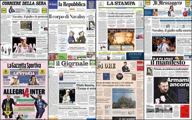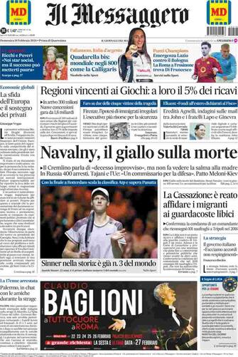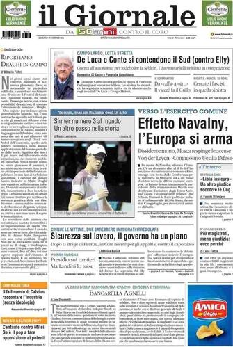 - Focus su Navalny: "Effetto Navalny, l'Europa si arma". Poi spazio a Sinner che entra nella storia. In tema politico, articolo su De Luca e Conte che "si contendo il Sud (contro Elly)". L'editoriale: "Riportiamo Draghi in campo"