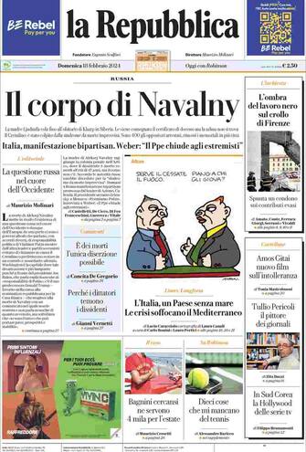 - Apertura con titolo "Il corpo di Navalny". Editoriale su "La questione russa nel cuore dell'Occidente". Spazio anche alla tragedia di Firenze. Riflessione di Baricco su "10 cose che mancano al tennis"