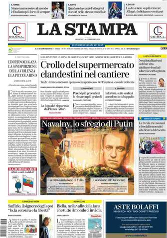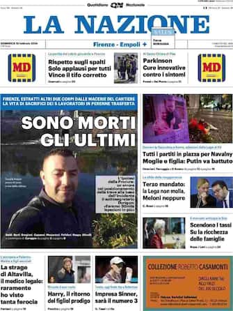 - Apertura con titolo dedicato a Firenze: "Crollo del supermercato clandestino nel cantiere". La foto centrale è dedicata a Navalny, con un riferimento allo "sfregio di Putin". Editoriale su Gaza