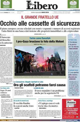- "Occhio alle cassette di sicurezza", questa l'apertura. Foto dedicata a "I pro-Gaza bruciano la foto della Meloni" a Torino. Poi un focus sul tema migranti, con il titolo: "Ora gli scafisti potranno farci causa"