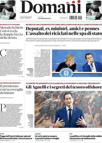- "Deputati, ex ministri, amici e peones. L'assalto dei riciclati nelle spa di Stato" è il titolo del quotidiano, con foto di Meloni e Salvini. Poi una riflessione sul "Metodo Schlein" e un focus sugli Agnelli "e i segreti del tesoro offshore"