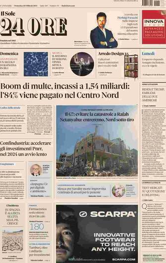 - Il quotidiano punta su "Boom di multe, incassi a 1,54 miliardi: l'84% viene pagato al Centro Nord". Foto dedicata a Gaza. Spazio anche a Confindustria e al Pnrr e all'allerta siccità in Spagna