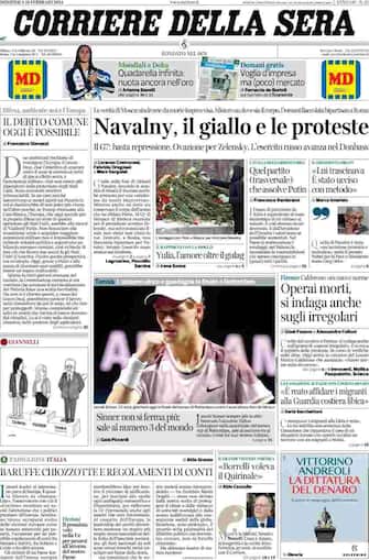 - Apertura con titolo "Navalny, il giallo e le proteste". Poi una foto e un titolo per Jannik Sinner, che raggiunge la finale nel torneo Atp di Rotterdam: "Sinner non si ferma più: sale a numero 3 del mondo". Spazio anche al crollo del cantiere di Firenze: "Operai morti, si indaga anche sugli irregolari"
