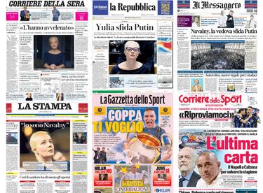 Oggi le aperture dei principali quotidiani italiani tornano a puntare sulla morte dell'oppositore russo Alexei Navalny con le parole della vedova che accusa apertamente Putin. Spazio poi all'emergenza smog in Pianura Padana e al caso Assange