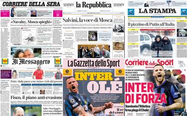 Aperture dei quotidiani dedicati, in gran parte, al caso Navalny e alla vittoria dell'Inter in Europa. La Farnesina ha deciso di convocare l'ambasciatore russo dopo la morte di Alexei Navalny, mentre Putin lancia messaggi "di vicinanza" all'Italia direttamente da Mosca. Il gol di Arnautovic lancia i nerazzurri nella sfida di andata degli ottavi di Champions League