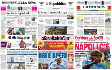 Aperture differenziate per i principali quotidiani nazionali. Il Corriere della Sera punta sulle polemiche seguite all'apertura dell'indagine della procura di Roma sulle procedure attuate dal Mit per la costruzione del Ponte sullo Stretto. Repubblica apre sulle riforme, mentre Stampa e Messaggero si concentrano sulla sicurezza sul lavoro. Sugli sportivi, tutto lo spazio è dedicato al pari tra Napoli e Barcellona, col ritorno al gol di Victor Osimhen