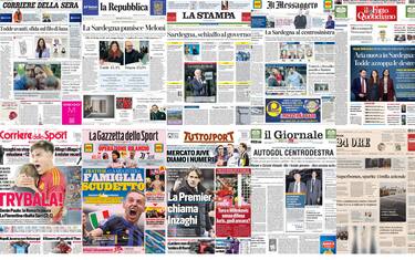 Le prime pagine dei quotidiani oggi lasciano grande spazio ai risultati delle elezioni regionali in Sardegna, con la vittoria della candidata del centrosinistra Alessandra Todde. Per la cronaca poi si torna sulla strage del Mottarone: il piccolo Eitan, unico sopravvissuto, riceverà un risarcimento da più di 3 milioni. Spazio poi al calcio con i risultati della Serie A