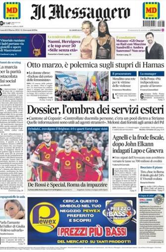 - Titolo principale sempre sull'inchiesta di Perugia: "Dossier, l'ombra dei servizi esteri". Taglio alto sulla Giornata internazionale delle donna: "Otto marzo, è polemica sugli stupri di Hamas" a cui si lega l'editoriale a firma di Luca Ricolfi: "La marcia per la parità ostacolata dai social". Fotonotizia sulla vittoria dei giallorossi in Europa League: "De Rossi è Special, Roma da impazzire". Taglio medio sul caso giudiziario sull'eredità della famiglia Agnelli