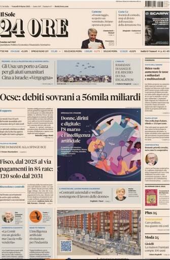 - L'apertura è sul nuovo report dell'Organizzazione per la Cooperazione e lo Sviluppo Economico: "Ocse: debiti sovrani a 56mila miliardi". Taglio alto dedicato al conflitto israelo-palestinese: "Gli Usa: un porto a Gaza per gli aiuti umanitari. Cina a Israele: 'Vergogna'". La fotonotizia centrale titola uno speciale: "Donne, diritti e digitale: l'8 marzo e l'intelligenza artificiale". In taglio basso, "Fisco, dal 2025 pagamenti in 84 rate: 120 solo dal 2031"