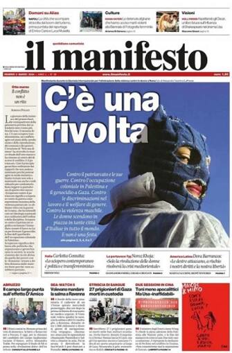 - Prima pagina quasi tutta dedicata all'8 marzo: "C'era una rivolta". L'editoriale di Adriana Pollice titola: "Il conflitto non è un rito". In taglio basso, il resto delle notizie: le Regionali in Abruzzo, il caso Sea-Watch e due approfondimenti sul conflitto Israele-Hamas
