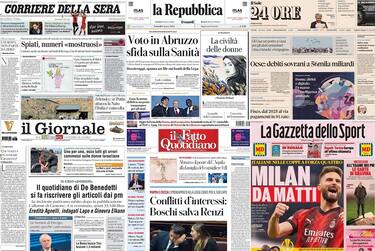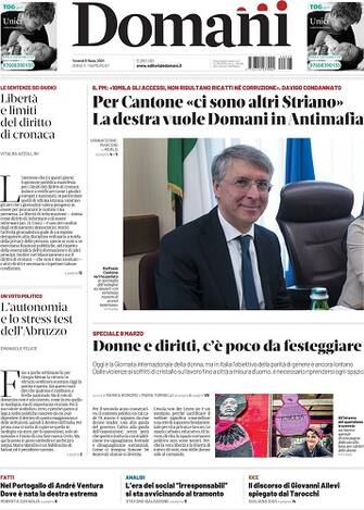 - Titolo principale sempre sull'inchiesta di Perugia, che vede coinvolto proprio il quotidiano di De Benedetti: "Per Cantone 'ci sono altri Striano'. La destra vuole Domani in Antimafia". In spalla, un focus tecnico sul caso: "Libertà e limiti del diritto di cronaca". Poi un approfondimento sulle Regionali: "L'autonomia è lo stress test dell'Abruzzo". In taglio basso, focus sull'8 Marzo: "Donne e diritti, c'è poco da festeggiare"