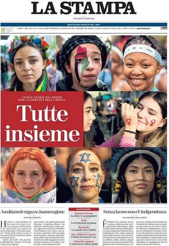 - Tutta la prima pagina è dedicata alla Giornata internazionale della donna. Il titolo principale è "Tutte insieme", a cui seguono due articoli di fondo: "Ascoltiamo le ragazze, hanno ragione" a firma di Annalisa Cuzzocrea" e "Senza lavoro non c'è indipendenza", scritto da Elsa Fornero e Anna Lo Prete