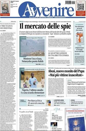 - Anche il quotidiano dei vescovi apre sull'inchiesta di Perugia: "Il mercato delle spie". Le due fotonotizie sono dedicate agli esteri: la guerra in Medio Oriente ("Missione Usa a Gaza, Netanyahu punta Rafah") e l'assalto a una scuola in Nigeria. In taglio medio, "Abusi, nuovo monito del Papa: 'Mai più vittime inascoltate'". L'articolo di fondo a firma di Mauro Magatti è sulla Russia: "I tre virus occidentali"