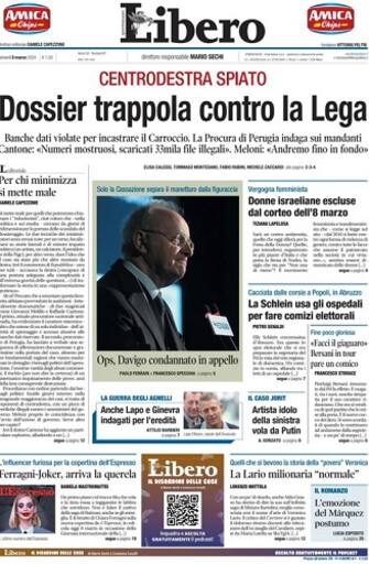 - Apertura sull'inchiesta di Perugia: "Dossier trappola contro la Lega". L'editoriale a firma di Daniele Capezzone titola: "Per chi minimizza si mette male". Fotonotizia centrale sul caso giudiziario dell'ex pm di Mani pulite: "Ops, Davigo condannato in appello". Nel taglio medio troviamo "Donne israeliane escluse dal corteo dell'8 marzo" a cui segue un articolo sulle elezioni in Abruzzo: "La Schlein usa gli ospedali per fare comizi elettorali"