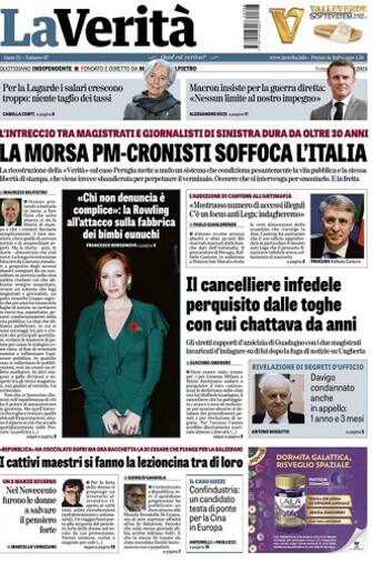 - Anche il quotidiano fondato da Maurizio Belpietro apre sul caso dossieraggio: "La morsa pm-cronisti soffoca l'Italia". Taglio medio titola "Il cancelliere infedele perquisito dalle toghe con cui chattava da anni". Fotonotizia dedicata alla scrittrice di Harry Potter: "'Chi non denuncia è complice': la Rowling all'attacco sulla fabbrica dei bombi eunuchi"
