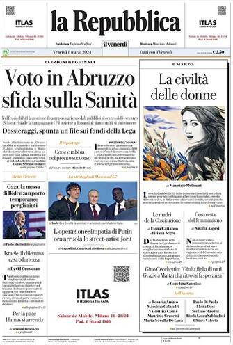- Apertura sulle Regionali di domenica: "Voto in Abruzzo, sfida sulla Sanità". In spalla, l'editoriale del direttore Molinari sull'8 marzo: "La cività delle donne", a cui segue un focus sulla Festa internazionale. Taglio medio sul conflitto Israele-Hamas: "Gaza, la mossa di Biden: un porto temporaneo per gli aiuti". Fotonotizia centrale sulla Russia: "L'operazione simpatia di Putin: ora arruola lo street-artist Jorit"