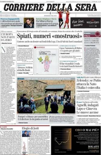 - Titolo di apertura sull’inchiesta dossieraggio di Perugia: “Spiati, numeri ‘mostruosi’”. In spalla, un focus sull'8 marzo: "Donne e lavoro, si può cambiare: ecco 4 proposte". L'articolo di fondo è sulla difesa comune in Ue: "L'Europa non parte da zero". La fotonotizia titola: "Pompei 'chiusa' per assemblea, e il direttore fa da guida ai turisti". Taglio medio sull'Ucraina ("Zelensky: se Putin attacca la Nato l'Italia è coinvolta") e sul caso eredità in casa Elkann: "Agnelli, indagati Lapo e Ginevra. Le nuove accuse"