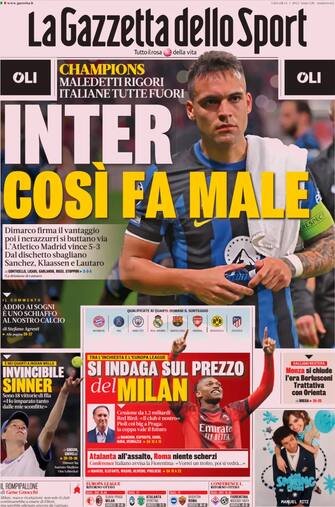 - Apertura dedicata ovviamente alla sconfitta ai calci di rigore dell'Inter negli ottavi di Champions League sulla Gazzetta dello Sport. La Rosea titola "Così fa male", accompagnato da una foto di Lautaro Martinez, autore dell'errore decisivo dal dischetto