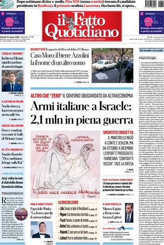 - Sul Fatto Quotidiano focus sull'invio di armi italiane a Israele: il quotidiano diretto da Marco Travaglio parla di una fornitura da 2,1 milioni di euro in pieno conflitto