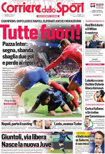- Il Corriere dello Sport mette in evidenza il flop del calcio italiano, con la contemporanea eliminazione di Inter, Napoli e Lazio agli ottavi della più importante competizione europea