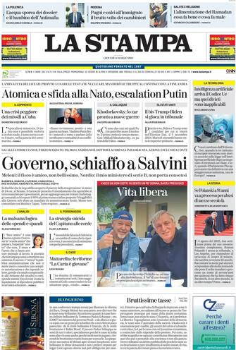 - Matteo Salvini protagonista anche dell'apertura della Stampa. Si parla di "schiaffo" al vicepremier da parte di Meloni e Nordio sui fronti Fisco e Giustizia. Anche qui, grossa evidenza viene data alle minacce alla Nato da parte di Putin