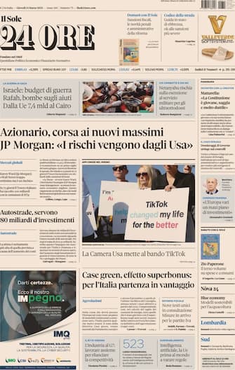 - Corsa ai massimi storici per il mercato azionario sulla prima del Sole 24 Ore, dove trova spazio anche la guerra in Medio Oriente, con le bombe piovute sugli aiuti a Rafah