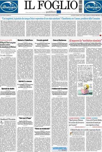 - Giustizia in primo piano, invece, sul Foglio, dove occupa l'apertura l'intervista col presidente della Cassazione Margherita Cassano