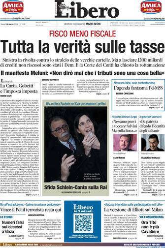 - La battaglia sul Fisco riecheggia anche sulla prima di Libero, dove si parla di "Tutta la verità sulle tasse". Di spalla, la sfida Schlein-Conte sulla Rai