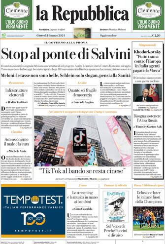 - Repubblica sceglie di dedicare la sua prima pagina allo stop imposto al Ponte sullo Stretto dal comitato scientifico, che segnala 68 mancanze strutturali nel progetto. Grande spazio anche al bando minacciato dagli Usa per TikTok