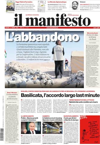 - Il tema degli aiuti a Gaza, con le conseguenti difficoltà per le Ong, è l'approfondimento dedicato dal Manifesto al conflitto in Medioriente con la fotonotizia di apertura