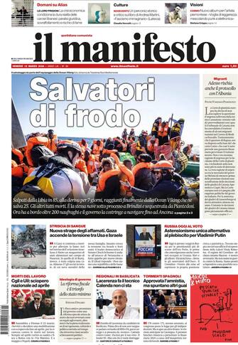 - Fotonotizia dedicata alla tragedia nel Mediterraneo in apertura del Manifesto. Il titolo scelto è "Salvatori di frodo"