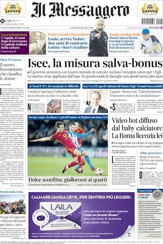 - Temi economici sulla prima del Messaggero. Si parla del nuovo metodo di calcolo dell'Isee allo studio del governo, che esclude l'assegno unico per i figli. Spazio alnche al passaggio del turno della Roma in Europa League, malgrado la sconfitta di misura col Brighton nel ritorrno degli ottavi