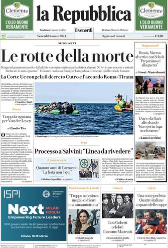 - Di migranti si occupa anche la prima pagina di Repubblica, scegliendo il titolo forte "Le rotte della morte". In secondo piano, le dichiarazioni allarmanti di Emmanuel Macron sul conflitto che potrebbe allargarsi oltre i confini ucraini e le beghe interne alla Lega di Matteo Salvini