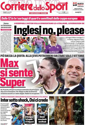 - Scelta controcorrrente del Corriere dello Sport, che punta sulle prospettive della Juventus di Max Allegri per la conquista di un posto nella nuova Champions League. Di spalla, l'anteprima del sorteggio per le italiane in Europa