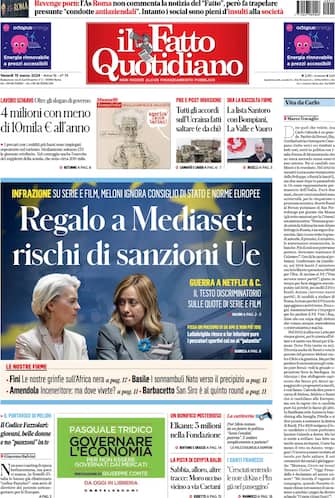 - Il Fatto Quotidiano titola "Regalo a Mediaset: rischio di sanzioni Ue" per parlare di presunte infrazioni legate alle quote di serie tv e film