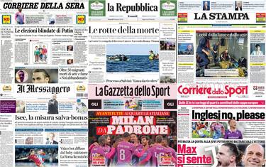 - Le elezioni in Russia sono il tema scelto dal Corriere della Sera per aprire l'edizione odierna. Urne aperte tra appelli di Putin al "voto patriota" e proteste bandite. Spazio poi all'ennesima tragedia nel Mediterraneo, con la morte di oltre 50 migranti abbandonati al largo della Libia