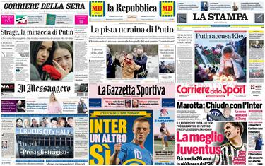 Tanti i temi affrontati dai quotidiani in edicola: le aperture sono tutte dedicate alla reazione di Putin dopo la strage dell'Isis a Mosca e all'innalzamento del livello di allerta in Europa e in Italia, ma c'è spazio anche a quanto accaduto a Bari (con le polemiche per le parole di Emiliano) e al caso Santanchè e le indagini su Villa Alberoni. Infine, la partita di stasera della Nazionale contro l'Ecuador e il mercato delle big