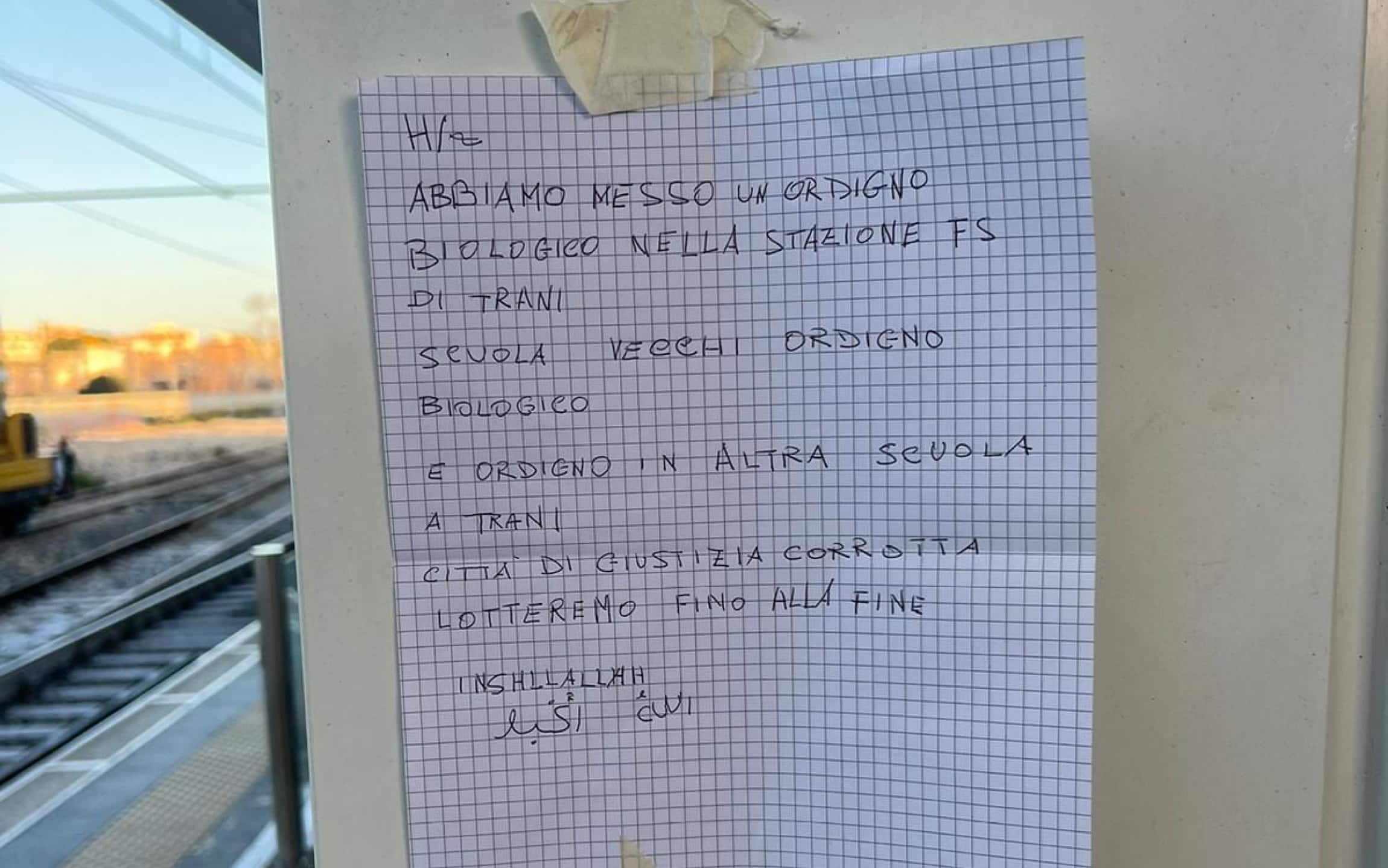 Un biglietto (scritto a mano) lasciato alla stazione delle Ferrovie dello Stato di Trani che avvisava di una presunta bomba biologica non solo nella stessa infrastruttura, ma anche in due scuole della città costiera (una veniva esplicitata l'altra no) aveva indotto il sindaco della città Amedeo Bottaro a chiudere per la giornata di oggi tutti gli istituti scolastici cittadini, per poi riaprirli dopo i controlli del caso. "A causa di un allarme bomba in una scuola non precisata, tutte le scuole cittadine di ogni ordine e grado resteranno chiuse nella giornata odierna", è stata la comunicazione postata sui canali social ufficiali del Comune. Una volta terminate le attività di bonifica nelle scuole di ogni ordine e grado di Trani è scattata quindi la retromarcia. Lo ha reso noto il Comune sempre sui propri canali social spiegando che le attività di controllo svolte dalle forze dell'ordine hanno dato "esito negativo".