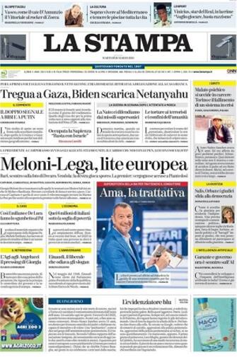 - Apertura sulle tensione nel centrodestra di governo: "Meloni-Lega, lite europea". In taglio alto, il Medioriente: "Tregua a Gaza, Biden scarica Netanyahu". In spalla, tre approfondimenti su diritti e giustizia: la storia del malato psichico suicida in carcere a Torino, il caso Salis e lo scontro Garante-Governo sull'Ai. Fotonotizia sul futuro di Amadeus in Rai: "Ama, la trattativa". In taglio medio quattro notizie di interni: il caos Decaro a Bari, i dati sulla povertà in Italia e l'anniversario di Einaudi