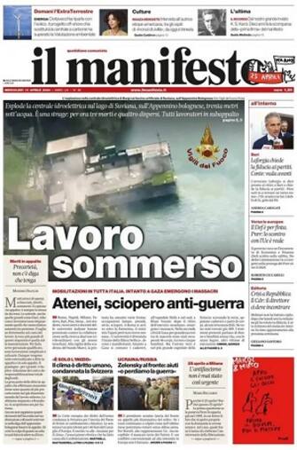 - Titolo principale con fotonotizia sulla strege di Suviana: "Lavoro sommerso". Lo accompagna un editoriale di Massimo Franchi: "Precarietà, non c'è diga che tenga". Taglio medio sulle proteste nelle universita contro il conflitto Israele-Gaza: "Atenei, sciopero anti guerra". In taglio basso troviamo, "Il clima è diritto umano, condannata la Svizzera" e "Zelensky al fronte: aiuti 'o perdiamo la guerra'"