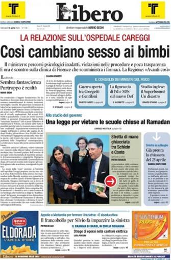 - Titolo principale sulla relazione del ministero della Salute sull'ospedale Careggi: "Così cambiano sesso ai bimbi". A questo segue l'editoriale di Mario Sechi: "Sembra fantascienza. Purtroppo è realtà". In taglio alto, un box con approfondimenti economici dopo il Cdm: tensioni tra Giorgetti e Gentiloni sul Def, un focus sulle opposizioni e il caso Superbonus. In taglio medio troviamo: "Una legge per vietare le scuole chiuse al Ramadam". Fotonotizia sul gelo tra Conte e Schlein