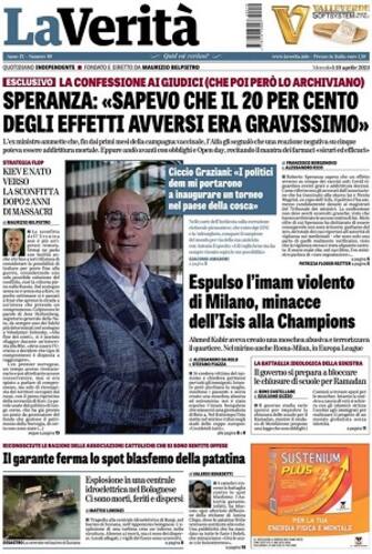 - Apertura sulla deposizione dell'ex ministro della Salute sui giorni della pandemia: "Speranza: 'Sapevo che il 20 per cento degli effetti avversi era gravissimo'". Fotonotizia con intervista a Ciccio Graziani: "I politici dem mi portarono a inaugurare un torneo nel paese della cosca". Taglio medio sul pericolo terrorismo: "Espulso l'imam violento di Milano, minacce dell'Isis alla Champions". Taglio basso sulle polemiche alla pubblicita delle Chips: "Il garante ferma lo spot blasfemo della patatina"