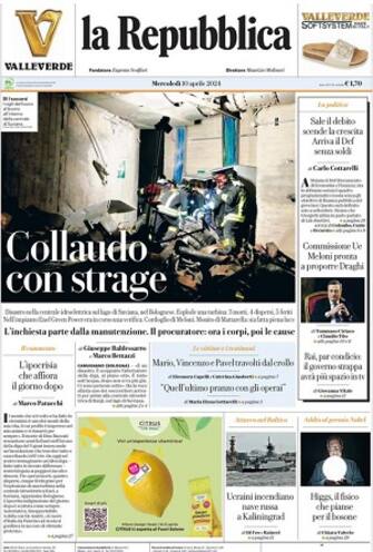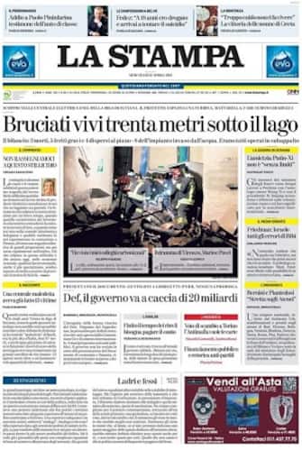 - Apertura sulla strage di Suviana: "Briciati vivi trenta metri sotto il lago". Poi due approfondimenti sul caso: il commento di Chiara Saraceno ("Non rassegnamoci a questo stillicidio") e il racconto di Paolo Baroni ("Una centrale maledetta, aveva fatto già 13 vittime"). Taglio medio sul Documento di economia e finanza: "Def, il governo va a caccia di 20 miliardi". In spalla, tre approfondimenti: rapporti Cina-Russia, intervista a Friedman su Netanyahu e le proteste negli Atenei contro Israele