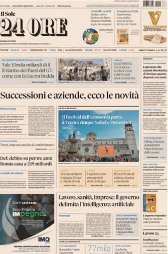 - Apertura sulla riforma del fisco: "Successione e aziende, ecco le novità". In taglio alto c'è l'approfondimento "Vale 10mila miliardi di dollari il riarmo dei Paesi del G7: come con la Guerra fredda" e un focus sul Medio Oriente: "Palestinesi, un popolo di profughi e rifugiati dalla nascita". Fotonotizia sulla kermesse in Trentino: "Il Festival dell'economia porta a Trento cinque Nobel e 280 eventi". In taglio basso, "Def: debito su per tre ani. bonus casa a 219 miliardi" e "Lavoro, sanità, imprese: il governo delimita l'intelligenza artificiale"