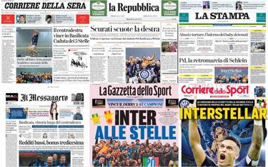 La netta affermazione del centrodestra alla Regionali in Basilicata e la conquista del 20esimo scudetto dell'Inter, ottenuto grazie alla vittoria nel derby sul Milan, dominano la maggior parte delle aperture dei giornali. Ma c'è spazio anche per gli strascichi del caso Scurati su Repubblica e per il dietrofront sulle Europee di Schlein sulla Stampa. Tredicesime e violenze nel carcere Beccaria di Milano gli altri temi in primo piano
