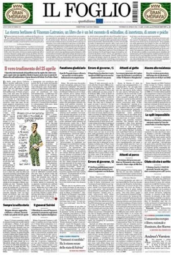- Nel titolo in taglio alto: "La ricerca berlinese di Vincenzo Latronico, un libro che è un bel racconto di solitudine, di incetezza, di amore e psiche". Nel titolo in taglio medio, focus sulle celebrazioni per Liberazione: "Il vero tradimento del 25 aprile"
